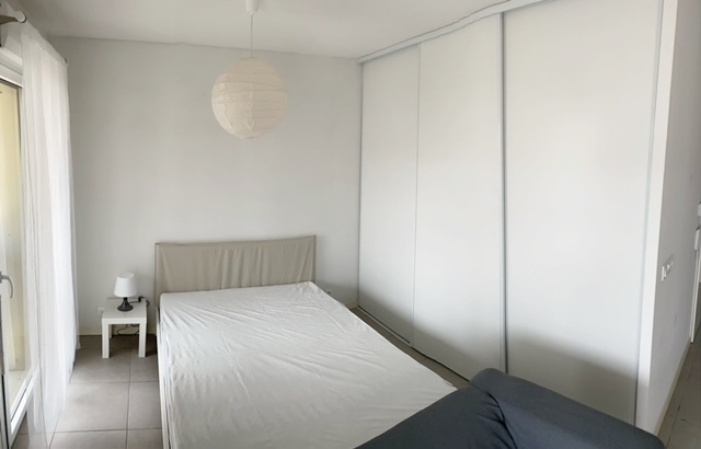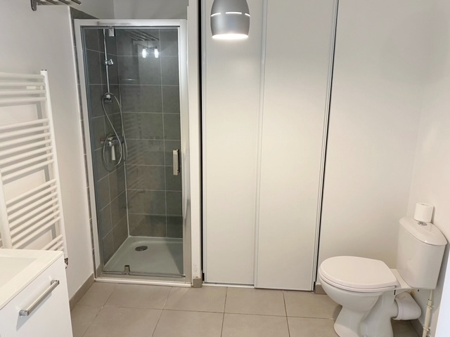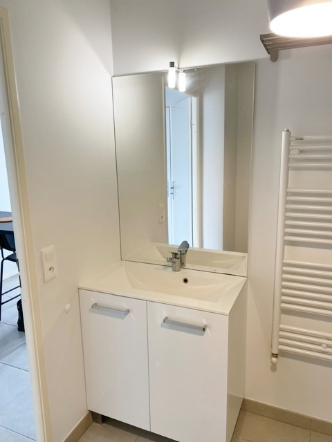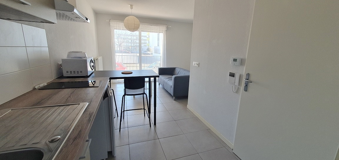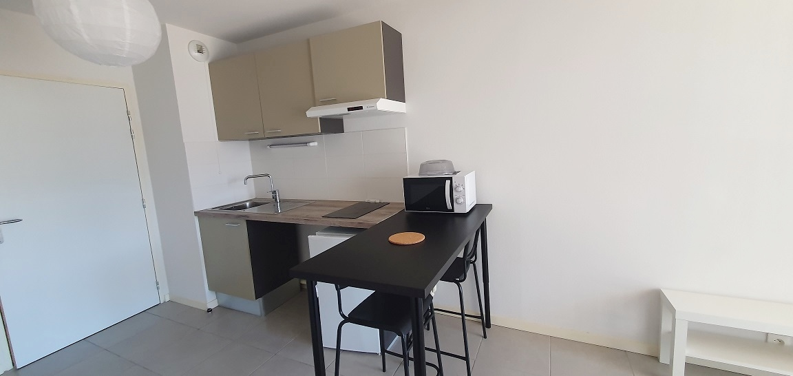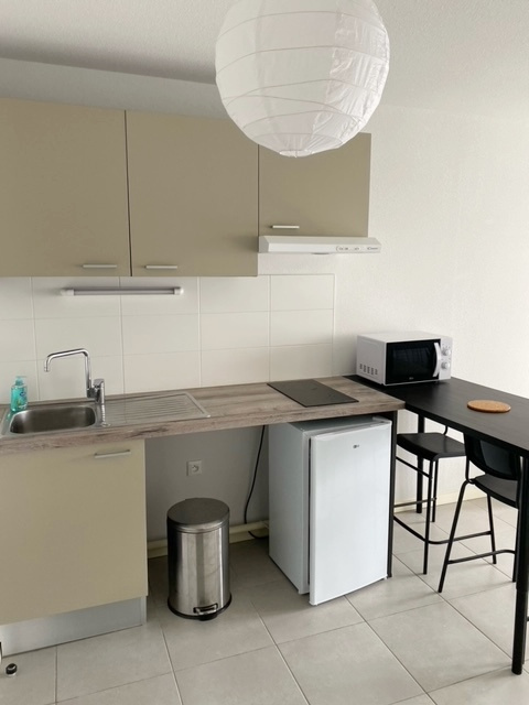 Dans résidence de 2019, agréable studio 27.70 m², rez-de-chaussée surélevé, entrée cuisine équipée ouverte sur pièce principale avec grand placard, salle d'eau avec wc.