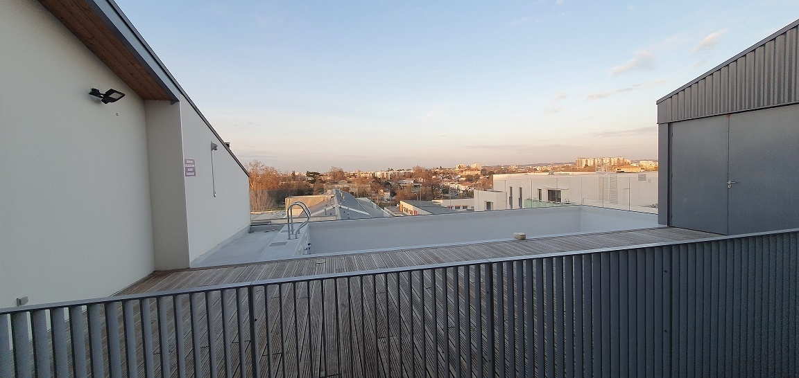 Résidence avec piscine et salle de sport communes.